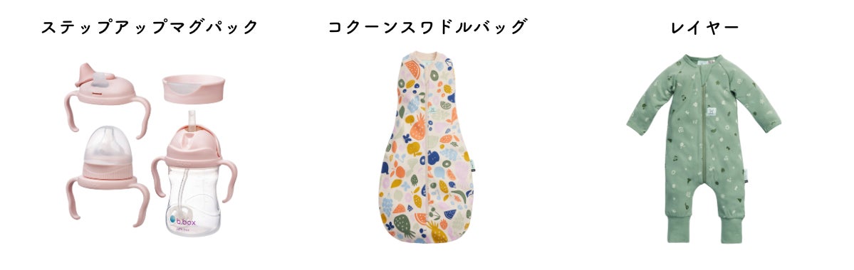 b.boxの「ステップアップマグパック」、ergoPouchの「コクーンスワドルバッグ」「レイヤー」の豪華3点セットが、抽選で15名様に当たるチャンスです!